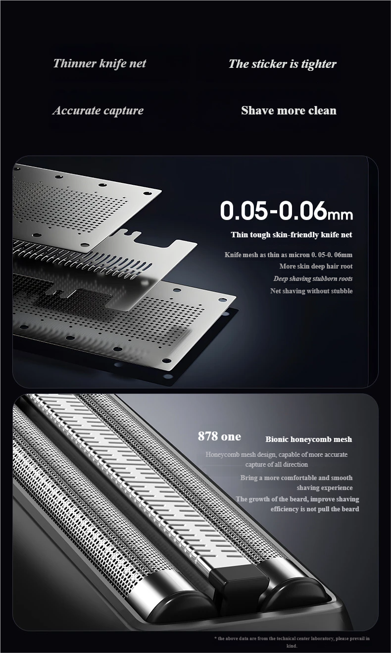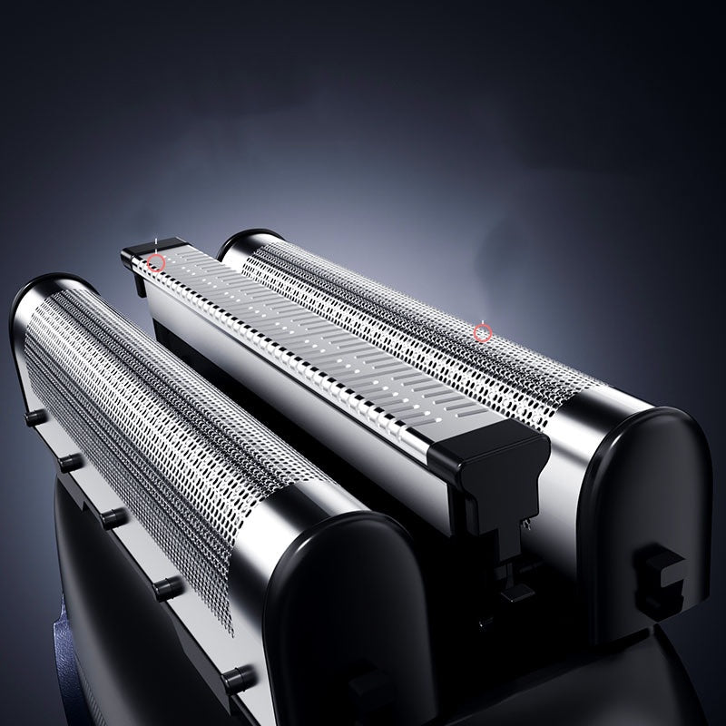 After numerous ergonomic tests, we designed an optimal blade layout combining foil shaving head with beard trimmer head. The rechargeable electric razor for men precisely handles stubble removal and long beard trimming, certified for professional barber-level performance